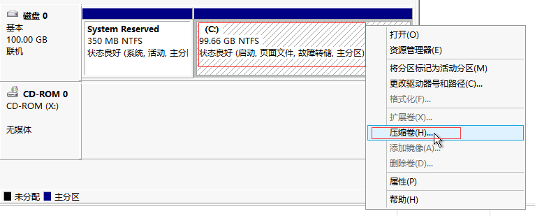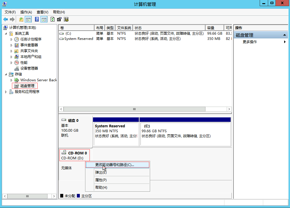 选择左侧磁盘管理,点击 CD-ROM 鼠标右键,选择更改驱动号和路径。