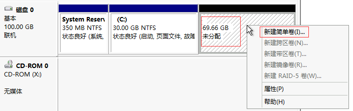 完成后就会显示压缩的磁盘,点击该磁盘,鼠标右键,选择新建简单卷。