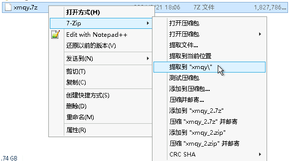 传到 D 盘后通过,点击文件鼠标右键选择菜单 7-Zip 中的提取到 xmqy/。