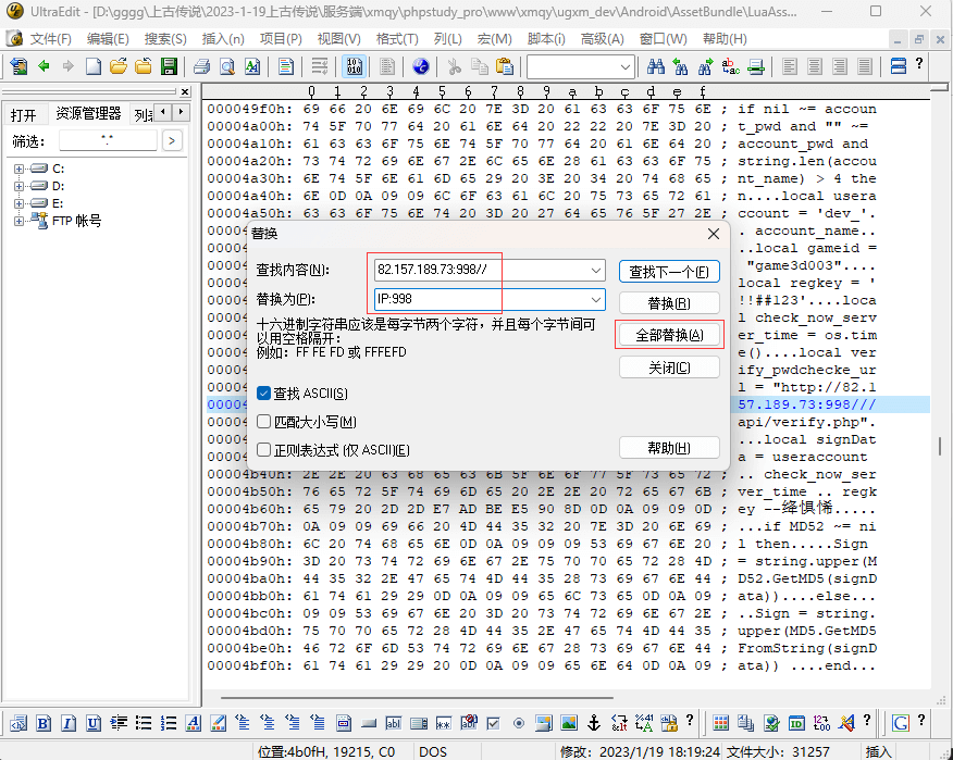 安卓和苹果热更文件修改都需要对位,以安卓第一个文件修改为例。搜索 82.157.189.73:998//,一共 19 位,改为你的 IP 后也要保持一共 19 位,如果 IP 位数少最后添加 /,比较长就最后删除 /。