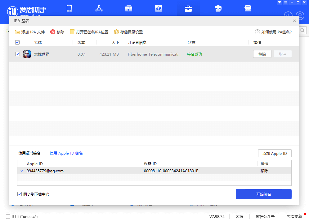 修改好后我们需要借助爱思助手签名,签名后就可以成功安装到自己的苹果手机中,需要在手机设置 - 通用 - 设备管理中信任该软件才可启动。