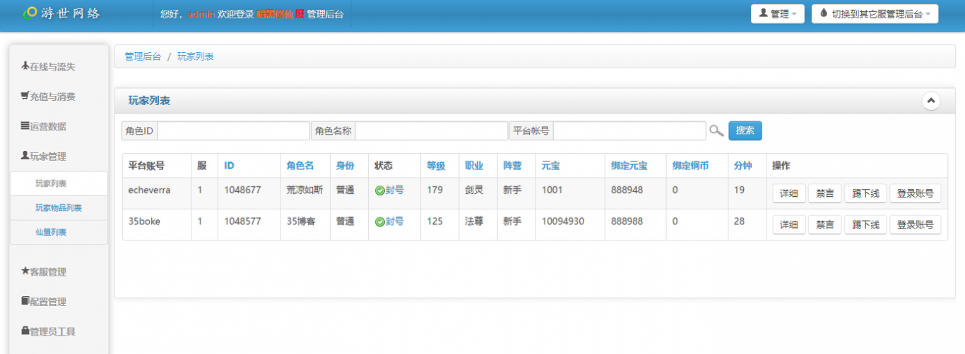 游戏运营后台:http://IP:9981/admin/admintool/,初始账号:admin,密码:123456,功能还是比较多的,可以自行尝试。