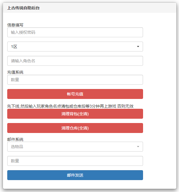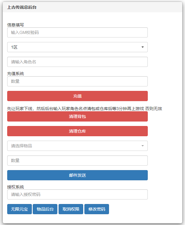 玩家 GM 后台:http://IP:9981/gm/,输入授权设置的密码,填写角色名就可以充值和发送物品了。