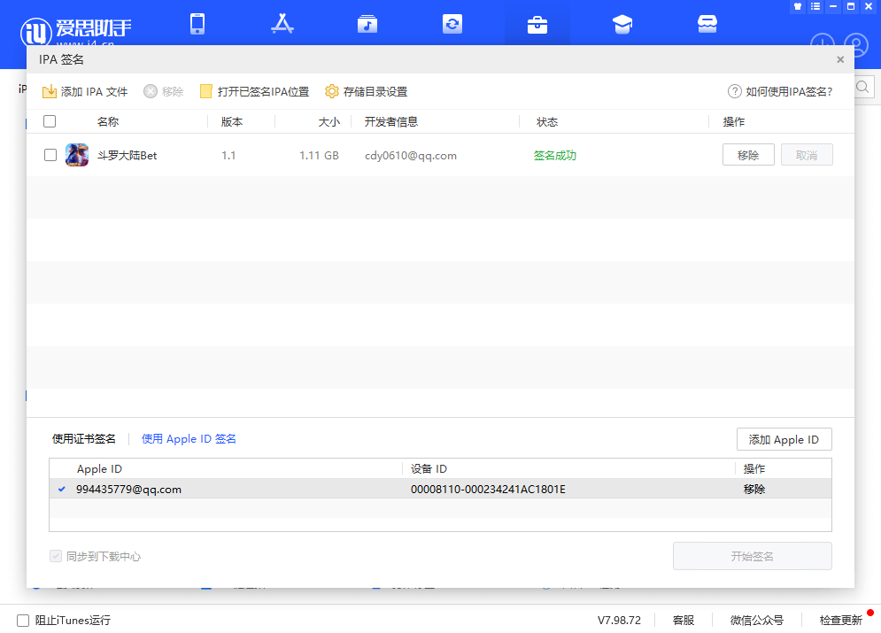 修改好后我们需要借助爱思助手签名,签名后就可以成功安装到自己的苹果手机中,需要在手机设置 - 通用 - 设备管理中信任该软件才可启动。